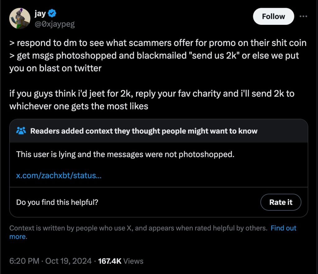 Jaypeg maintains that the wallet address posted in the Telegram group was a “random address” — which prompted the influencer to delete the messages featuring the address from the Telegram group.